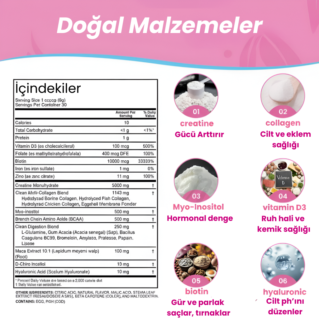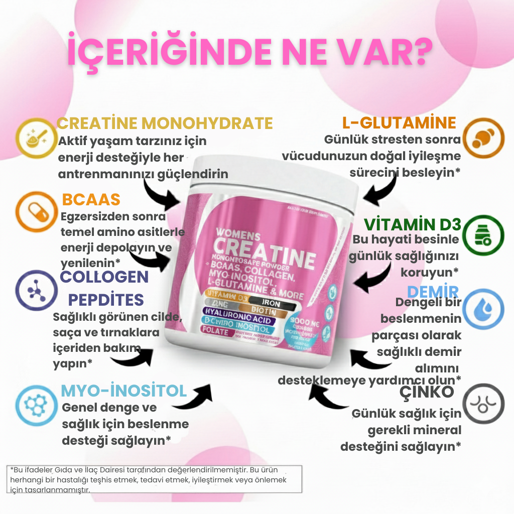 Temiz kreatin ve BCAA'ları bir araya getirerek güçlenmenize, kalça kaslarınızı büyütmenize ve şişkinlik veya o iri görünüm olmadan daha hızlı toparlanmanıza yardımcı oluyoruz. Geleneksel kreatinin yan etkileri olmadan daha güçlü hissetmek, daha fit görünmek ve formda kalmak isteyen kadınlar için tasarlandı.